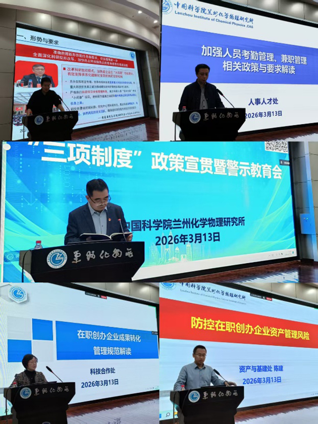 為進(jìn)一步加強(qiáng)科研項(xiàng)目申報(bào)管理、人員兼職管理和崗位管理等“三項(xiàng)制度”的執(zhí)行和有效監(jiān)管,3月13日,中國科學(xué)院蘭州化學(xué)物理研究所舉辦“三項(xiàng)制度”政策宣貫暨警示教育會(huì)。