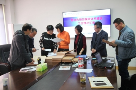 各單位匯報了近五年建立健全懲治和預防腐敗體系建設工作及“兩性”審計“雙覆蓋”工作完成情況,并著(zhù)重圍繞黨風(fēng)廉政建設“兩個(gè)責任”落實(shí)、制度體系建設與完善、廉潔從業(yè)風(fēng)險防控工作、黨風(fēng)、作風(fēng)建設、科研學(xué)風(fēng)道德建設、監督執紀“四種形態(tài)”的開(kāi)展等交流了有益經(jīng)驗,分析了工作不足,探討了改進(jìn)思路。檢查組還現場(chǎng)翻閱查看了各類(lèi)文件資料、制度匯編等。