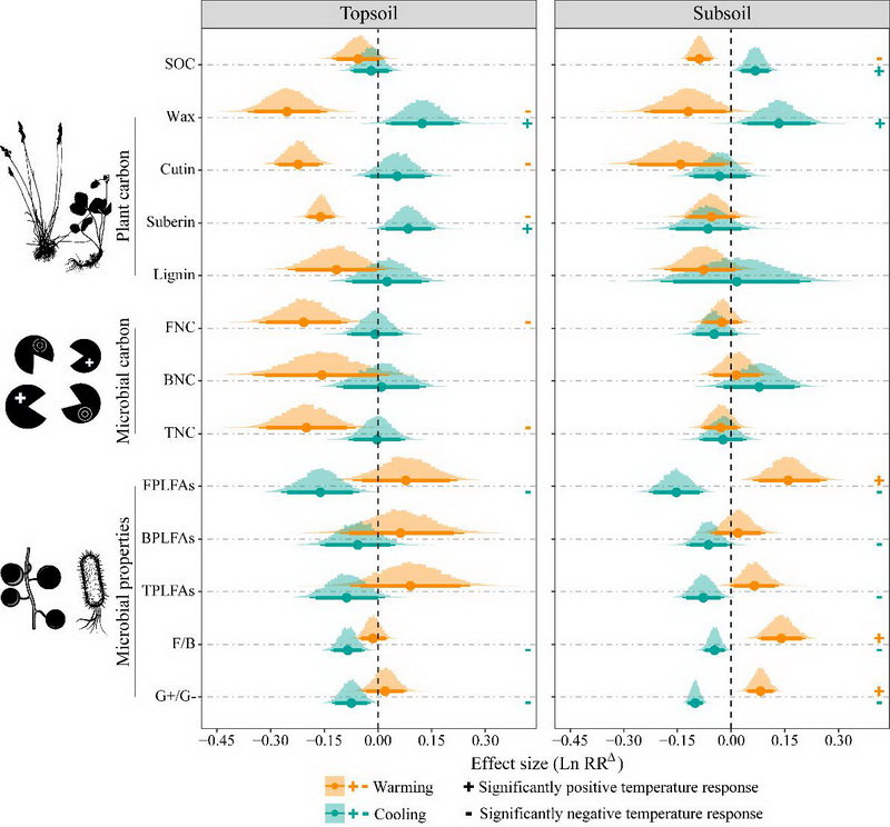 中國科學(xué)院西北高原生物研究所高寒生態(tài)系統與全球變化研究團隊依托2007年在青海海北高寒草地生態(tài)系統國家野外科學(xué)觀(guān)測研究站建立的“山體垂直帶雙向移栽實(shí)驗”平臺,基于生物標志物技術(shù),并借助貝葉斯Meta統計分析在估計研究間異質(zhì)性和合并效應量方面的優(yōu)勢(尤其在納入研究數量較少時(shí))、獨特的后驗分布估計、靈活的參數設置和便利的結果圖形化展示方法等特點(diǎn),創(chuàng )新性地采用貝葉斯Meta分析方法分析控制實(shí)驗數據,對多組處理、對照實(shí)驗進(jìn)行了歸納性總結,進(jìn)而系統評估量化了增溫、降溫16年后高寒草甸表層(0-10 cm)和亞表層土壤(20-30 cm)有機碳含量的影響因素(包括植物生物量和多樣性、土壤理化性質(zhì)、植物源碳組分,微生物源碳組分以及微生物群落特性等)的變化及其與有機碳含量的關(guān)系。