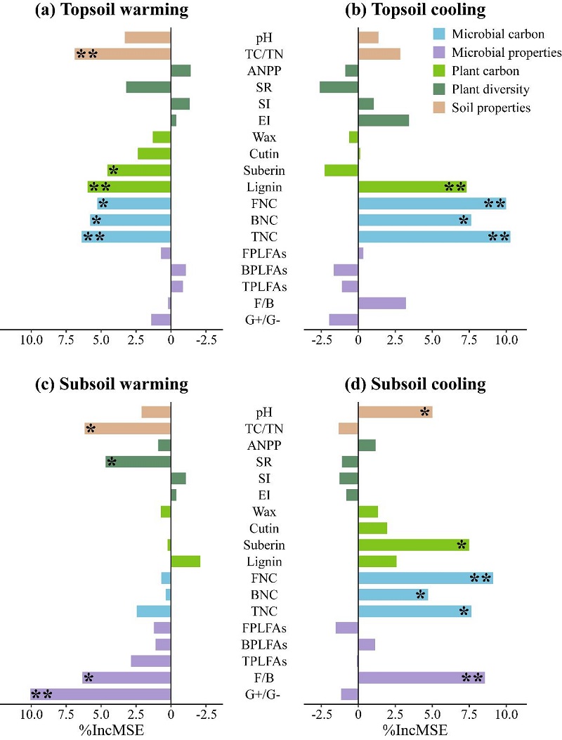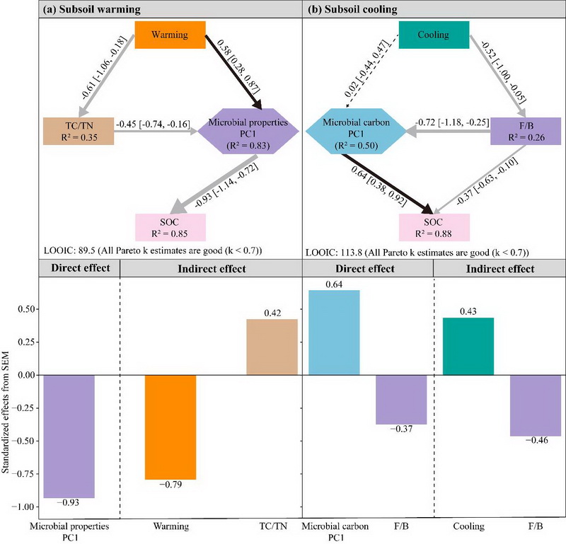 研究發(fā)現,高寒草甸亞表層土壤有機碳對增溫、降溫的響應較表層更為敏感,無(wú)論是增溫還是降溫,均未引起亞表層土壤中植物和微生物源碳組分的顯著(zhù)變化。然而,增溫使真菌與細菌生物量比值(F/B)和革蘭氏陽(yáng)性細菌與革蘭氏陰性細菌生物量比值(G+/G-)分別增加15.0%和8.6%,而降溫則使其分別降低4.5%和9.6%。進(jìn)一步分析發(fā)現,增溫主要通過(guò)增加F/B和G+/G-直接減少土壤有機碳庫的積累,同時(shí)降低土壤碳氮比間接減少亞表層土壤有機碳含量,而降溫則主要通過(guò)降低F/B增加亞表層土壤有機碳含量。如果只考慮增溫而不考慮降溫的作用,傳統的增溫控制實(shí)驗可能會(huì )低估氣候變暖對高寒草地亞表層土壤有機碳庫的消極作用。該研究為更好地解釋和預測未來(lái)氣候變化背景下高寒草地生態(tài)系統土壤碳庫的形成與變化提供了新的理論依據。