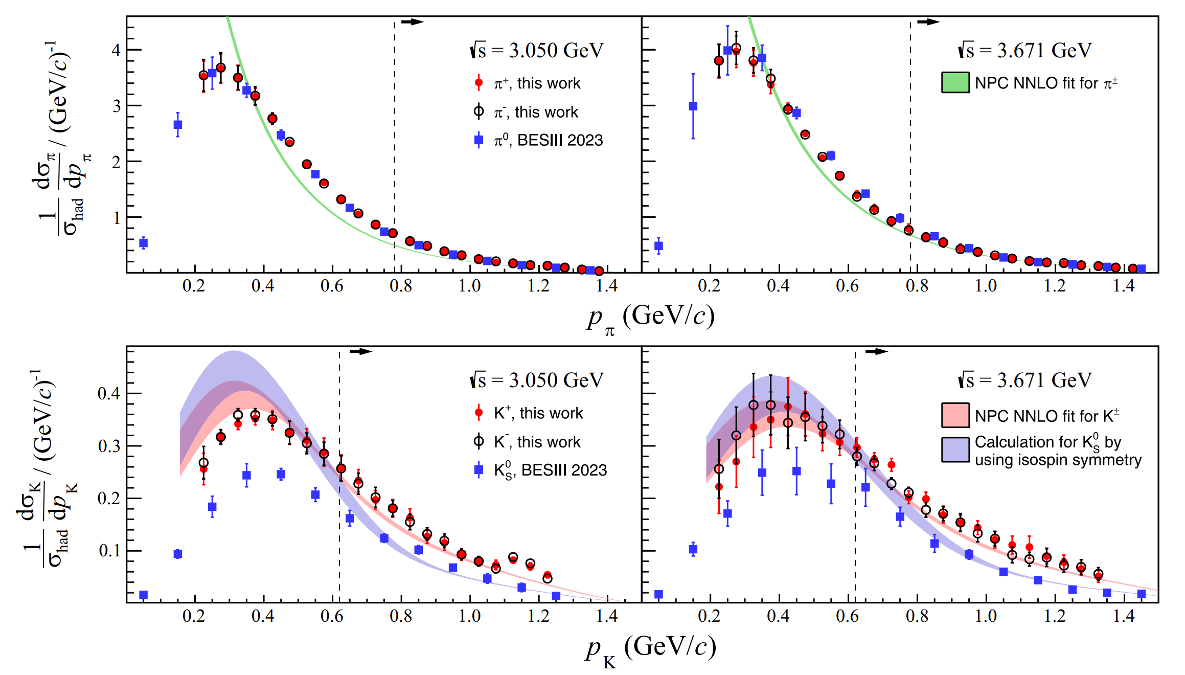 面對這一挑戰,團隊利用北京譜儀(BESIII)能量掃描數據,精確測量了帶電pion和Kaon介子單舉產(chǎn)生微分截面,最高精度達1%~2%。結合NPC合作組(Non-perturbative Physics Collaboration)的全局數據擬合研究,這一新的測量結果與基于次次領(lǐng)頭階(NNLO)精度的量子色動(dòng)力學(xué)(QCD)理論分析相符合,尤其是大動(dòng)量強子區域(如圖2所示)。該研究成果為檢驗低能區QCD因子化定理及部分子碎裂過(guò)程中同位旋對稱(chēng)性的有效性提供了有力的實(shí)驗支持,對深入理解強相互作用動(dòng)力學(xué)具有重要意義。