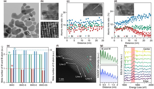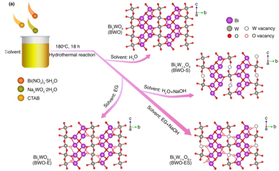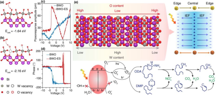 中國科學(xué)院青海鹽湖研究所輕合金與稀散元素分離課題組根據鉀鹽浮選藥劑性質(zhì)特點(diǎn),聚焦綠色高效處理的研究需要,結合高原地區自然光輻照強度大等優(yōu)勢,優(yōu)化光催化材料缺陷工程改性策略,成功制備金屬/非金屬雙缺陷鉍酸鹽光催化材料,考察其對可見(jiàn)光的吸收利用,并對雙缺陷結構改性鉍酸鹽光催化劑的催化作用機制開(kāi)展深入剖析。研究發(fā)現,在水熱制備Bi2WO6過(guò)程中加入適當比例的還原劑(EG)和刻蝕劑(NaOH),可以實(shí)現“一鍋法”在Bi2WO6納米片的中心和邊緣區域分別構筑O缺陷和W缺陷,強化提升鉍酸鹽的催化性能。機理研究發(fā)現:在雙缺陷結構材料(BWO-ES)中,W缺陷作為負電荷中心,O缺陷充當局部的正電荷中心。當這些帶相反電荷的缺陷在晶格不同位置建立時(shí),使Bi2WO6材料的靜電偶極距由本體材料(BWO)的1.54 D提升至BWO-ES的48.15 D,促使材料的內建電場(chǎng)強度提升2.74倍,為光生電子-空穴對的有效分離提供了內部驅動(dòng)力,從而抑制光生載流子的復合,表現的瞬態(tài)熒光壽命由BWO的1.61 ns提升至BWO-ES的2.63 ns。此外,O缺陷的構筑降低了材料的帶隙(2.78 ev→2.54 eV),拓展了材料的光響應范圍(446 nm→488 nm)。在可見(jiàn)光(λ≥400 nm)照射下,BWO-ES對十八胺(ODA)和十二烷基嗎啉(DMP)的降解速率分別達到13.31 mg/L·h和14.40 mg/L·h,是本體BWO材料降解速率的3.64倍和3.59倍,可實(shí)現鹽溶液中ODA、DMP的完全礦化。