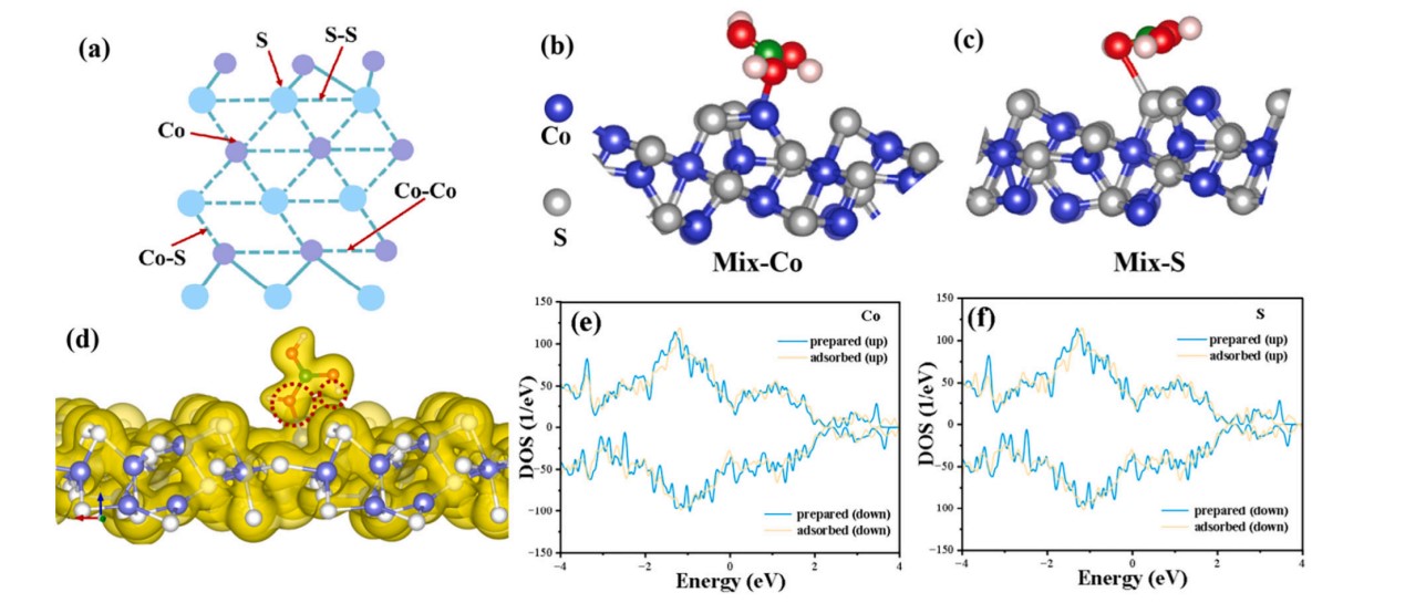 圖2.(a)ZIF-67衍生Co3S4中空吸附劑的吸附位點(diǎn)示意圖;(b-c)H3BO3在Co?S?上最穩定的結構(Co和S位點(diǎn));(e,f)不同位點(diǎn)Co?S?吸附H3BO3的DOS圖。
