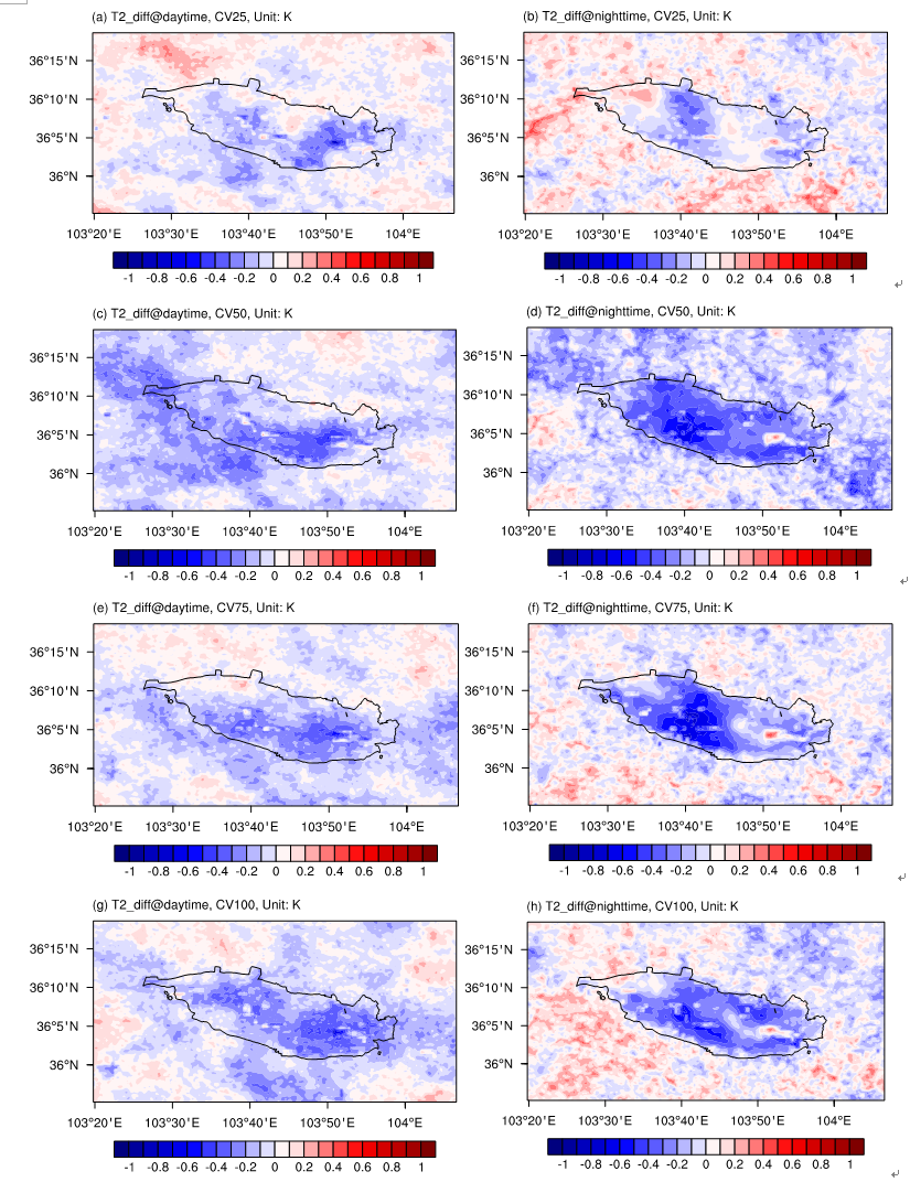 不同RPVPs部署情景下,平均2米氣溫差值(減去CTL)的空間分布