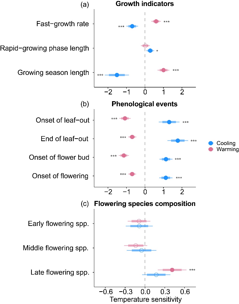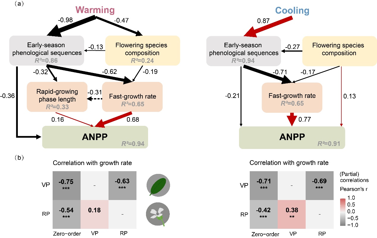 研究結(jié)果表明,在15年增溫處理下,ANPP顯著增加,而在降溫處理下降低。值得注意的是,增溫對(duì)ANPP的促進(jìn)效應(yīng)隨時(shí)間推移逐漸增強(qiáng),而降溫的抑制效應(yīng)則未表現(xiàn)出顯著的時(shí)間依賴(lài)性。重要的是,生長(zhǎng)季早期物候影響了ANPP對(duì)增溫和降溫的響應(yīng)。關(guān)鍵發(fā)現(xiàn)在于,生長(zhǎng)季早期的物候變化在調(diào)節(jié)ANPP對(duì)溫度變化的響應(yīng)中發(fā)揮重要作用。具體而言,增溫條件下ANPP的增加與植物返青期提前及生長(zhǎng)速率加快密切相關(guān);而在降溫條件下,葉片與開(kāi)花物候?qū)χ参锷L(zhǎng)表現(xiàn)出解耦的級(jí)聯(lián)效應(yīng):返青期提前反而抑制了植物后續(xù)生長(zhǎng),而開(kāi)花期推遲則部分抵消了前期的不利影響。