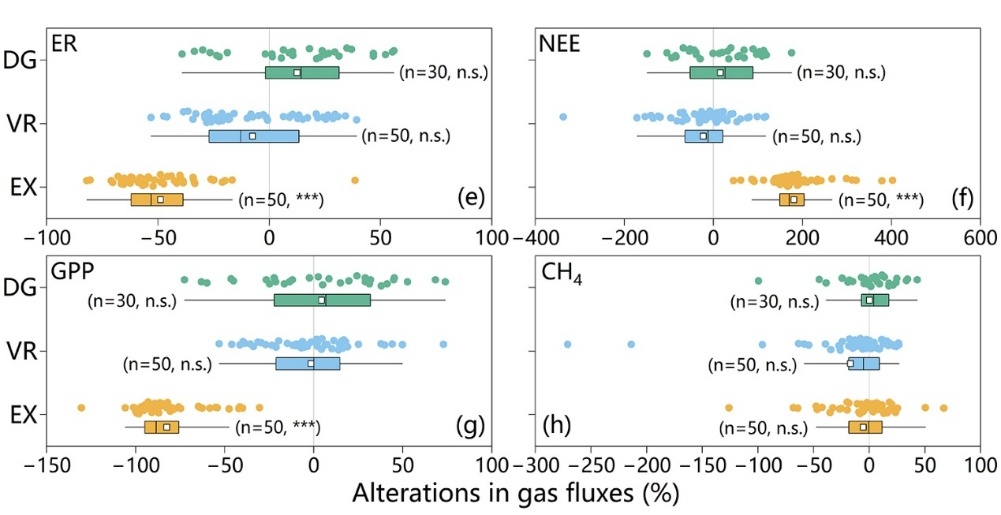 研究表明,熱融滑塌顯著削弱了高寒草地的碳匯功能。與未擾動(dòng)區(qū)域相比,在植被被剝蝕的裸露地表,生態(tài)系統(tǒng)呼吸降低了49%,而總初級(jí)生產(chǎn)力則下降82%,導(dǎo)致凈生態(tài)系統(tǒng)交換增加181%,由碳匯完全轉(zhuǎn)變?yōu)樘荚础km然裸露地表表現(xiàn)出持續(xù)的CH4吸收,但其吸收量級(jí)遠(yuǎn)不足以抵消額外排放的CO2。