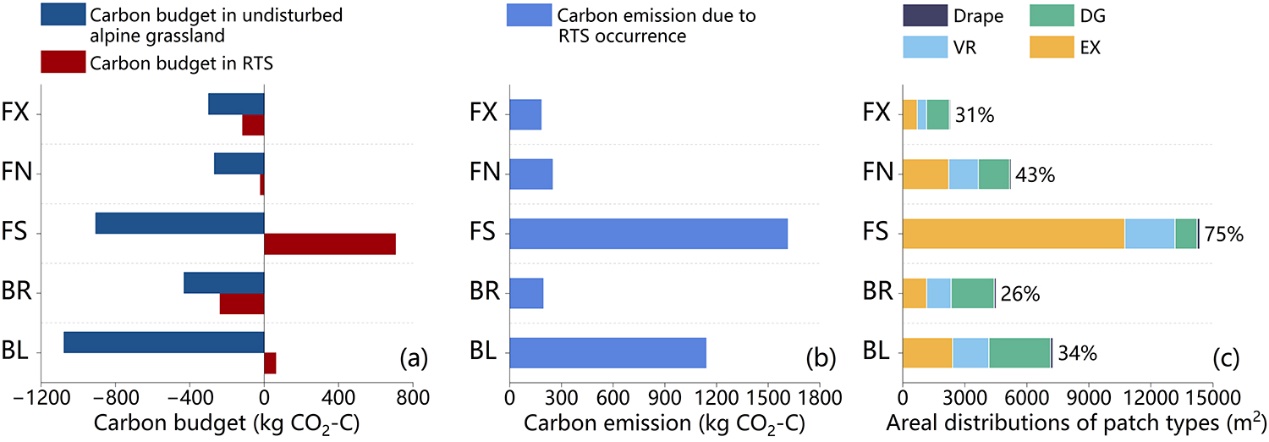 青藏高原是全球最大的高海拔多年凍土區(qū),儲(chǔ)存著大量土壤有機(jī)碳。近年來(lái),隨著氣候變暖、多年凍土廣泛退化,熱融滑塌、熱融溝和熱融湖塘等反映多年凍土快速融化現(xiàn)象的熱喀斯特地貌廣泛發(fā)育,其對(duì)高寒生態(tài)系統(tǒng)碳循環(huán)和氣候反饋的影響備受關(guān)注。然而,與熱融溝和熱融湖塘相比,無(wú)論是青藏高原還是環(huán)北極多年凍土區(qū),熱融滑塌(retrogressive thaw slumps,RTS)對(duì)凍土生態(tài)系統(tǒng)碳動(dòng)態(tài)的影響都缺乏系統(tǒng)性研究。