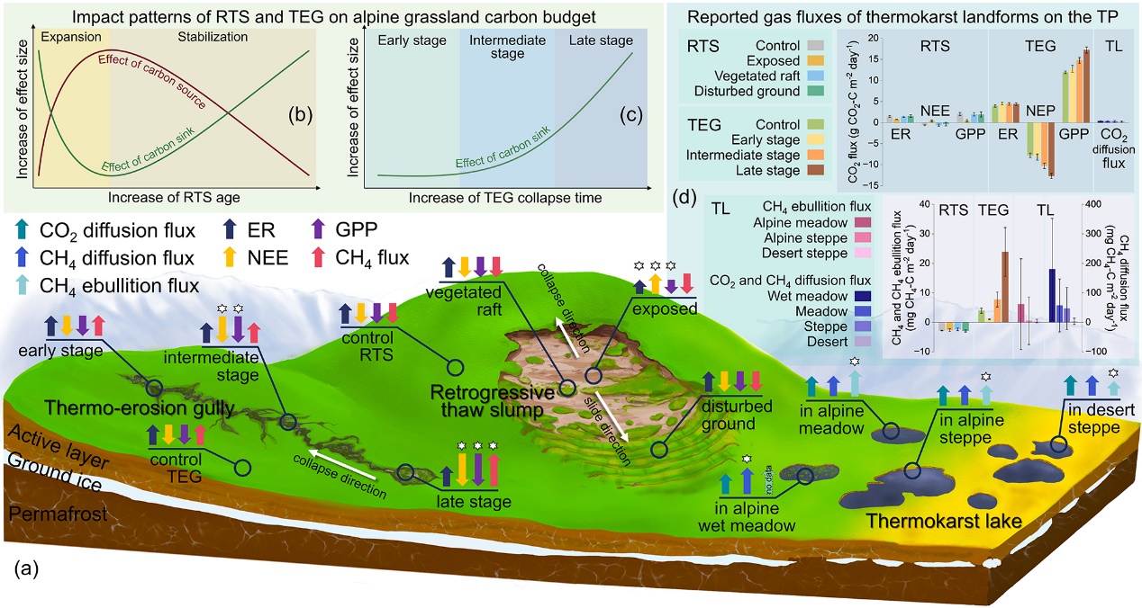 該研究成果以Thaw slumps alter ecosystem carbon budget in alpine grassland on the Tibetan Plateau為題,發(fā)表于國(guó)際期刊Nature Communications。西北研究院蔣觀利研究員為論文第一作者,吳青柏研究員為通訊作者。該研究得到國(guó)家重點(diǎn)研發(fā)計(jì)劃項(xiàng)目、國(guó)家自然科學(xué)基金面上項(xiàng)目和甘肅省自然科學(xué)基金項(xiàng)目的資助。
