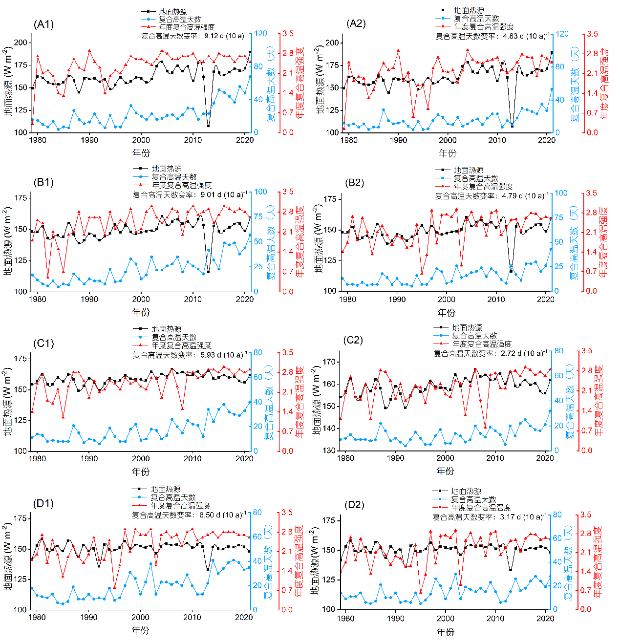 1979–2021年4個城市群地面熱源、復合高溫天數(shù)和年度復合高溫強度的年際變化。(A) 珠江三角洲;(B) 長江三角洲;(C) 成渝地區(qū);(D) 京津冀地區(qū)。1:基準期1981–2010年;2:基準期1991–2020年