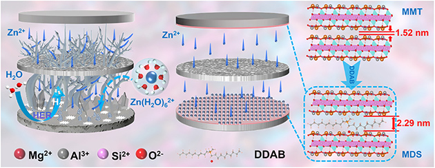 在上述研究工作基礎上,為進一步拓寬Zn2+的傳輸通道、實現(xiàn)“親鋅疏水”和Zn(002)晶面沉積的有效調控,研究團隊通過雙十二烷基二甲基溴化銨(DDAB)插層MMT成功制備出MDS改性黏土礦物材料,并將其均勻涂覆于鋅箔表面構筑出MDS@Zn復合陽極。研究結果表明,MDS涂層不僅能夠有序引導Zn2+傳輸、促進(002)晶面擇優(yōu)沉積,且能有效阻隔電解液與鋅負極之間的直接接觸,繼而顯著抑制鋅枝晶生長、析氫反應及腐蝕副反應。DFT計算證明,MDS對Zn2+、H2O和SO42–表現(xiàn)出更強的吸附能,進一步驗證了其優(yōu)異的電化學界面調控能力。電化學研究表明,MDS@Zn對稱電池在2mA cm–2和1mAh cm–2條件下可實現(xiàn)超過3620小時的穩(wěn)定循環(huán),在5mA cm–2的高電流密度下仍能連續(xù)運行3800小時。MDS@Zn||Cu半電池在1mA cm–2和1mAh cm–2條件下循環(huán)3600小時后,平均庫侖效率高達99.5%。此外,基于MDS@Zn負極與VO2正極構建的全電池在2.5A g–1下經歷1300次循環(huán)后,容量保持率仍達95.5%,展現(xiàn)出優(yōu)異的循環(huán)穩(wěn)定性和應用前景。