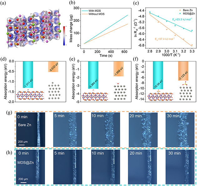 圖3. (a) MDS的靜電勢(ESP)分布圖。(b) 電化學石英晶體微天平(EQCM)測試中,有無MDS層時電鍍過程的質量變化圖。(c) 基于電荷轉移電阻計算的裸鋅和MDS@Zn陽極的活化能。(d)、(e)、(f) 分別為Zn2+、H2O和SO42–在裸鋅和MDS陽極(002)晶面上的吸附能圖。(g) 裸鋅陽極和 (h) MDS@Zn陽極在10mA cm–2電流密度下鋅沉積過程的原位光學顯微鏡圖像。
