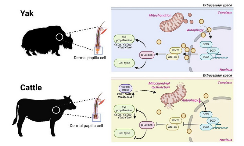 研究團隊進一步利用ATAC-seq與ChIP-qPCR發(fā)現(xiàn)了轉(zhuǎn)錄因子SOX4可直接結(jié)合WNT1與WNT3A基因的啟動子區(qū)域,且這一結(jié)合對基因的轉(zhuǎn)錄激活作用通過雙熒光素酶實驗得到驗證。SOX4的表達受自噬水平調(diào)控,激活自噬可挽救SOX4抑制劑對DP細胞增殖的抑制作用。該調(diào)控通路在牦牛體中表現(xiàn)出更強的信號活性,通過促進DP細胞周期進程、增強細胞增殖能力來維持毛囊穩(wěn)態(tài);同時,該通路還能改善線粒體結(jié)構(gòu)完整性以抵御氧化應(yīng)激,從而可能促進毛囊生長,系統(tǒng)性增強牦牛對高原寒冷環(huán)境的生存適應(yīng)能力??傊?,研究團隊從單細胞水平解析了牦牛毛囊適應(yīng)高原寒冷環(huán)境的分子特征,為理解動物對高原極端環(huán)境的適應(yīng)機制提供了重要基礎(chǔ)數(shù)據(jù)。