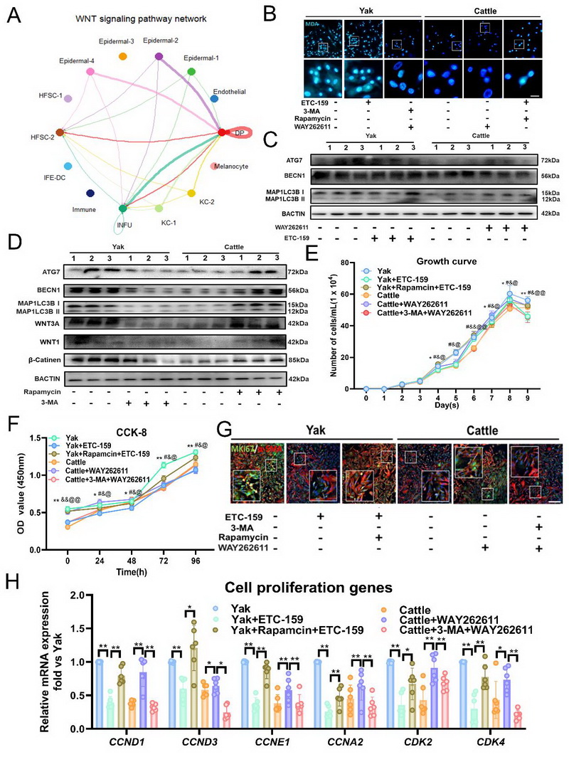文章代表圖:DP細胞中自噬與增殖的相互作用由WNT/β-Catenin通路介導(dǎo)。(A)DP細胞單細胞數(shù)據(jù)中WNT信號通路的細胞相互作用圖。(B)不同處理后牦牛和普通牛DP細胞的MDA活細胞染色。(C)牦牛、牦牛+ETC-159、普通牛和普通牛+WAY262611處理組DP細胞中ATG7、BECN1和LC3I/II的蛋白質(zhì)印跡分析(n=3)。(D) 牦牛、牦牛+3-MA、普通牛和普通牛+雷帕霉素處理組DP 細胞中ATG7、BECN1、LC3I/II、WNT3A、WNT1和β-Catenin的蛋白質(zhì)印跡分析(n=3)。(E-F)牦牛、牦牛+ETC-159、牦牛+雷帕霉素+ETC-159、普通牛、普通牛+WAY262611和普通牛+3-MA+WAY262611組DP細胞的生長曲線(n=9)和CCK-8檢測結(jié)果(n=4)。(G)不同處理組牦牛和普通牛DP細胞體外培養(yǎng)后PCNA和MKi67的代表性免疫熒光圖像(n=8)。(H)實時熒光定量PCR檢測細胞增殖相關(guān)基因CCND1、CCND3、CCNE1、CCNA2、CDK2和CDK4的mRNA表達情況(n=6)
