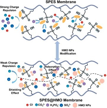 針對上述挑戰(zhàn),中國科學院青海鹽湖研究所離子吸附科學與技術課題組提出了一種氯離子膜“電荷屏蔽效應”設計策略,開發(fā)了一種由磺化聚醚砜(SPES)與水合錳氧化物(HMO)顆粒復合的新型混合基質膜-氯離子吸附膜(SPES@HMO)。該膜利用HMO納米顆粒調控膜界面電荷環(huán)境,從而特異性增強氯離子的傳輸,同時結合競爭吸附機制抑制多價陰離子的通過,為高鹽廢水中氯離子的高精度篩分提供了全新解決方案。