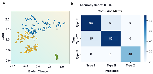 團(tuán)隊(duì)進(jìn)一步引入機(jī)器學(xué)習(xí)分類(lèi)方法,以ICOBI(晶體軌道鍵指數(shù))和Bader電荷轉(zhuǎn)移量為特征,訓(xùn)練支持向量分類(lèi)器。五折交叉驗(yàn)證表明分類(lèi)器達(dá)到較高準(zhǔn)確率,在不依賴(lài)電負(fù)性概念的前提下,從電子結(jié)構(gòu)層面揭示了共價(jià)鍵合與離子鍵合特性之間的區(qū)別是不同吸附物應(yīng)變響應(yīng)差異的物理本質(zhì)。