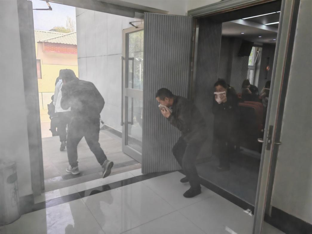 理論培訓后,參訓人員在政安消防工作人員指導下開(kāi)展實(shí)戰演練。模擬場(chǎng)景設定為學(xué)術(shù)報告廳因電路短路引發(fā)火情,濃煙迅速蔓延。隨著(zhù)警報響起,應急指揮組立即啟動(dòng)預案,疏散引導員按分工組織人員低姿捂鼻,沿安全通道撤離至指定集合點(diǎn)。隨后,又組織人員使用干粉滅火器對模擬火源進(jìn)行撲滅。整個(gè)演練過(guò)程響應迅速、分工明確,快速進(jìn)行安全疏散。
