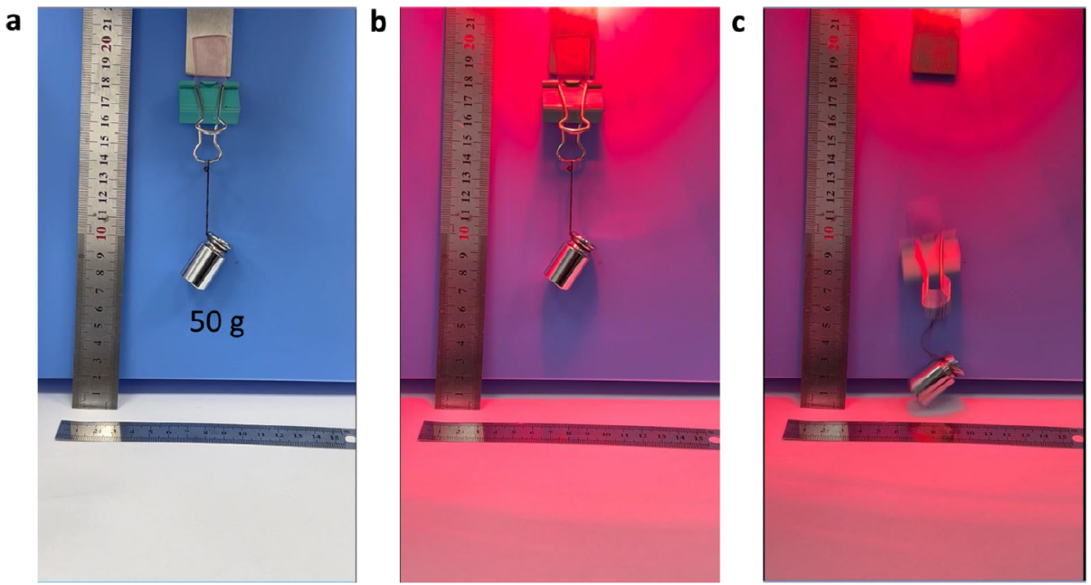 3. 響應速度:光照觸發(fā)脫黏在幾秒內即可完成,真正實(shí)現了用之即黏,取之即脫。正如下圖中所示,研究團隊演示了該材料在不銹鋼基板上的光熱響應行為,初始狀態(tài)下可穩定懸掛50g重物,近紅外光照后因黏附性能切換而黏附失效。
